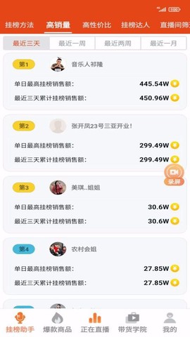 2、点击挂榜助手,一键筛选查看推荐的直播间和直播数据,让你不再错过任何精彩。